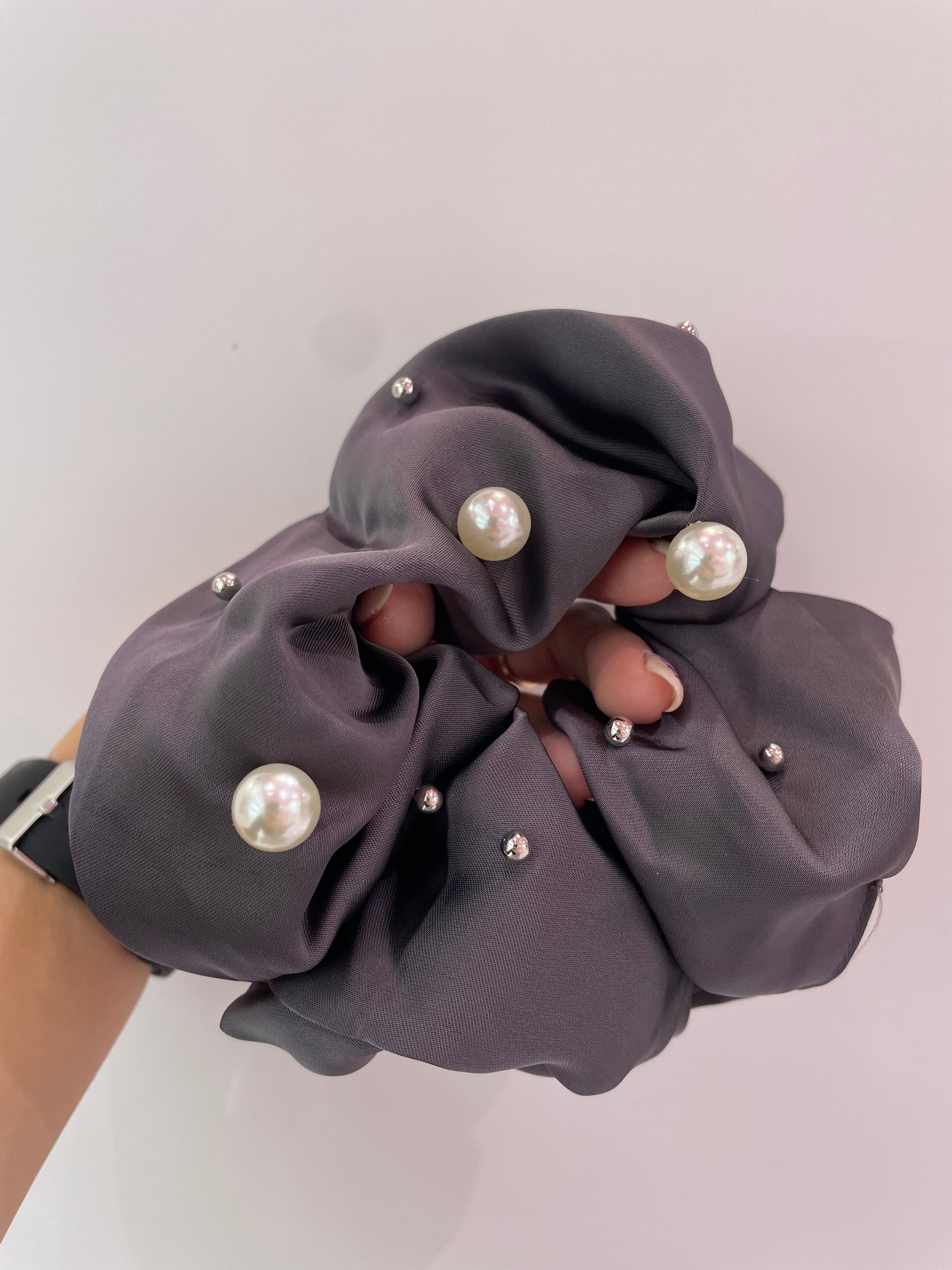 深みのあるダークグレーにパールとストーンが散りばめられたシュシュ