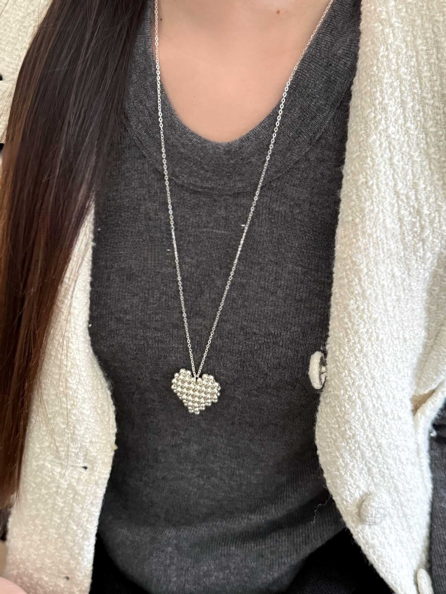 ビーズでできたハートモチーフとシルバーカラーの組み合わせがシンプルなから高級感のあるアイテムです