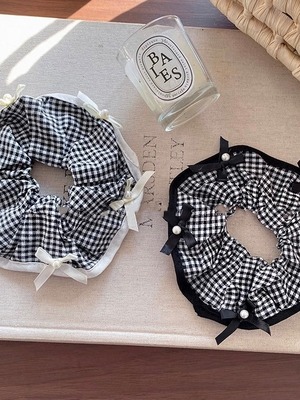 クラシカルなギンガムチェックに小さなパールとリボンを散りばめたシュシュ♡