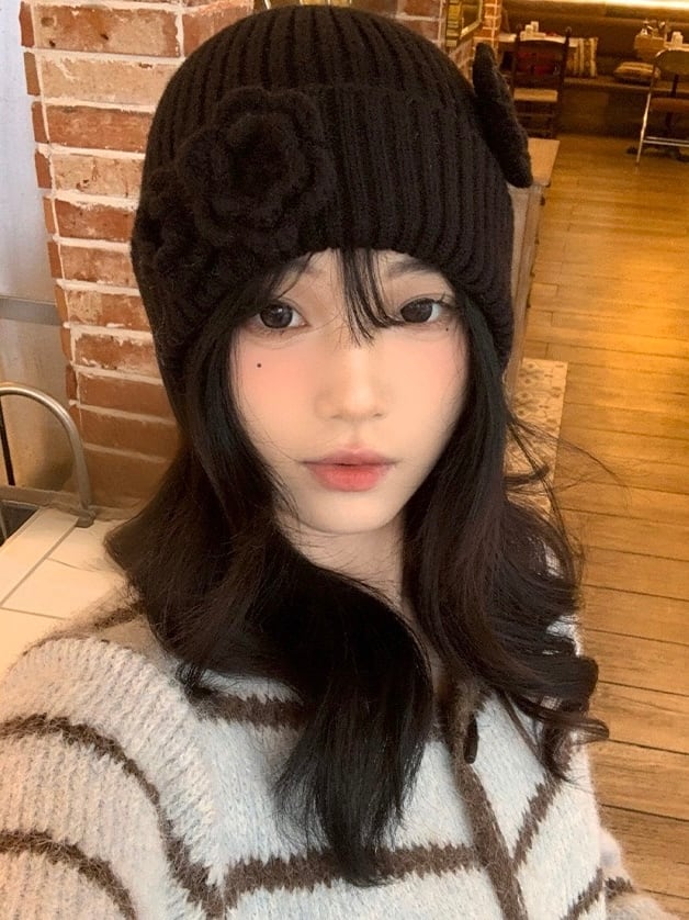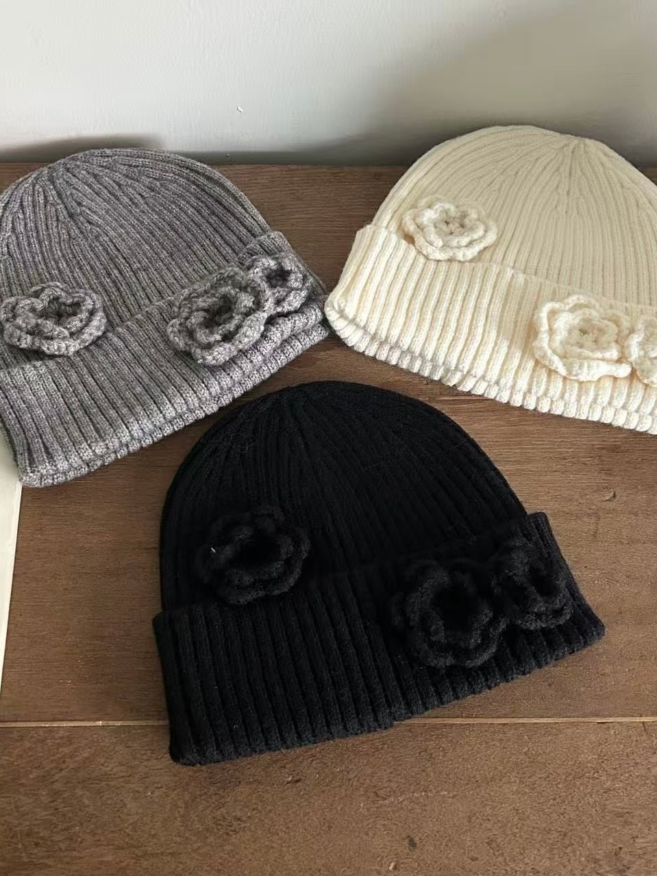立体感のあるフラワーモチーフがポイントのニットビーニー。