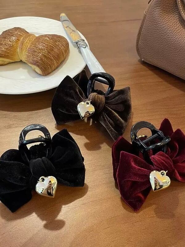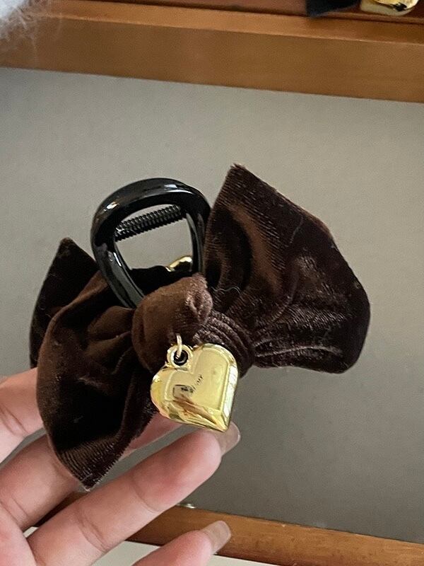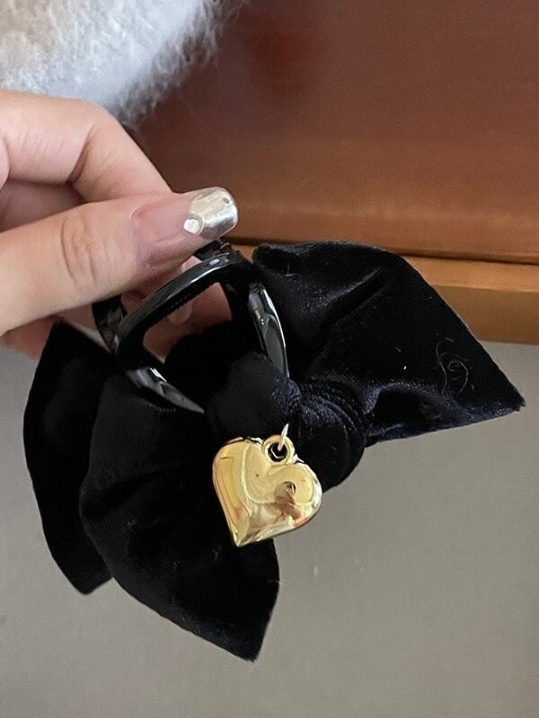 上質感のあるベロア素材のリボンにゴールドのハートチャームをあしらったヘアクリップ