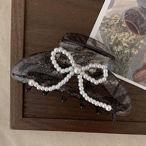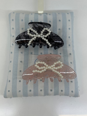 クリップのレース柄の上品さと、パールビーズのリボンの可愛らしさを兼ね備えたヘアクリップです
