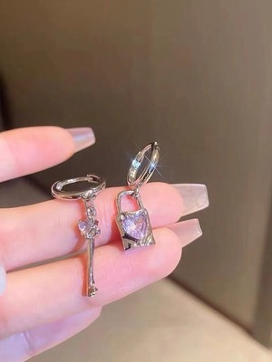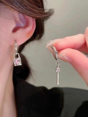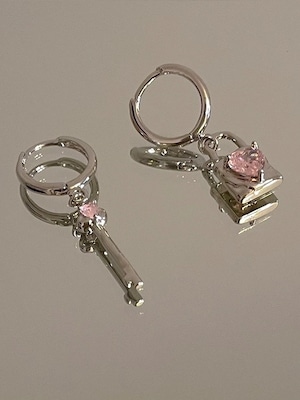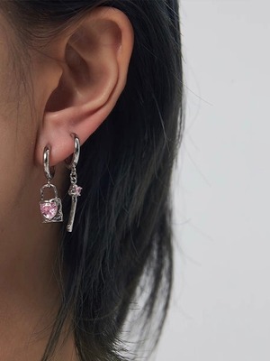 ピンクストーンがきらっと映える、ロックとキーのアシンメトリーデザインピアス。
