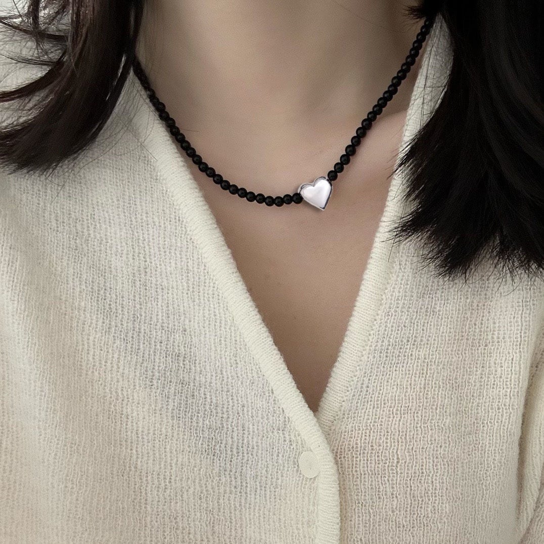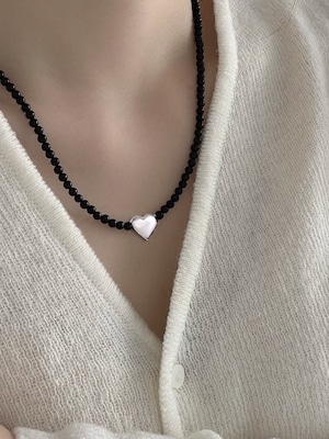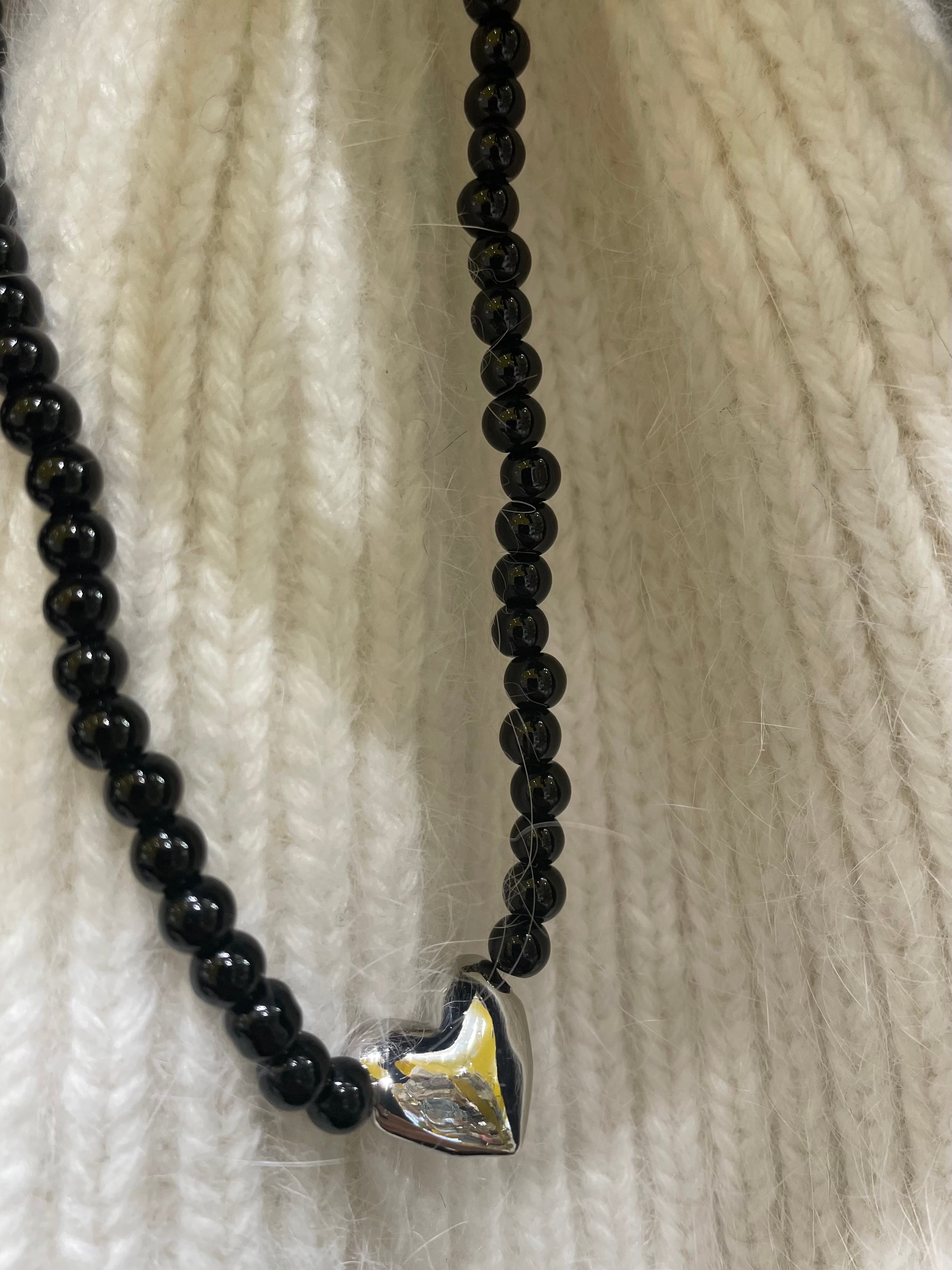 艶やかな黒いストーンにシルバーのハートストーンを組み合わせた存在感のあるネックレス
