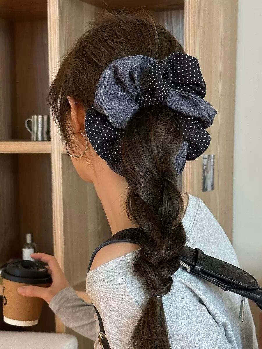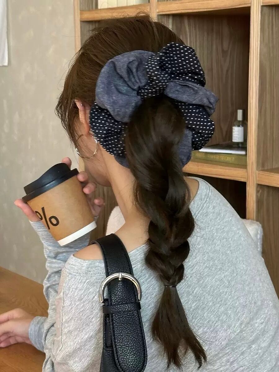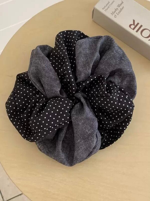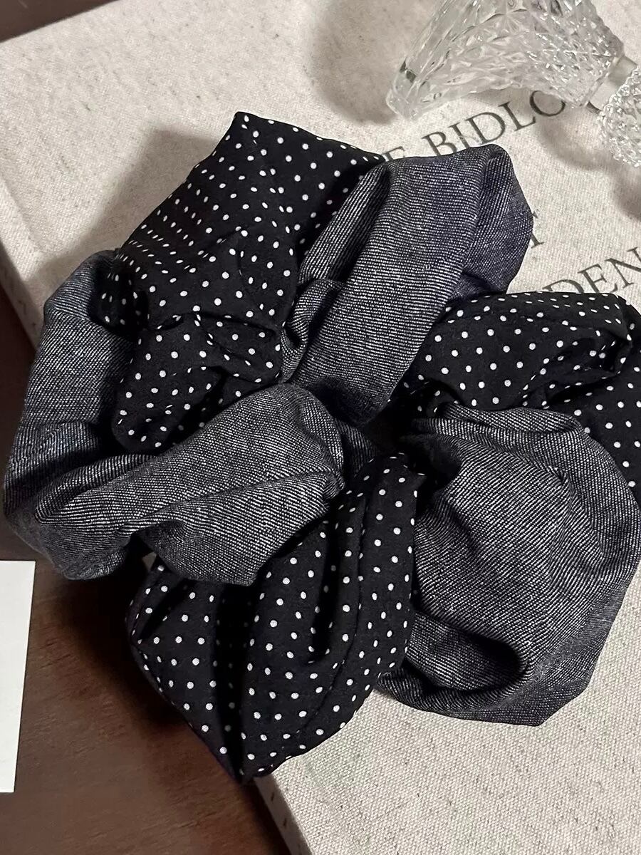 デニム素材とドット柄を組み合わせたレイヤーデザインのシュシュ