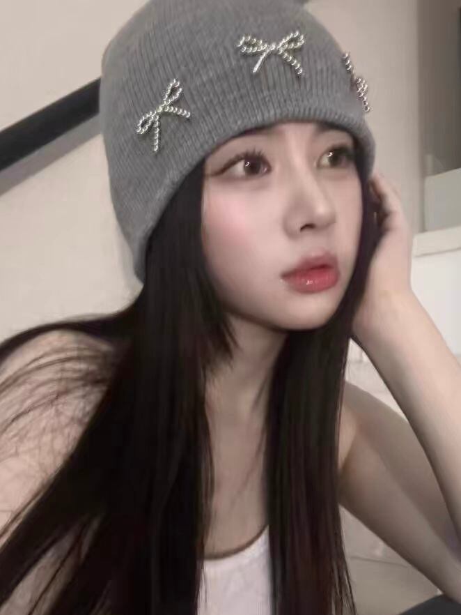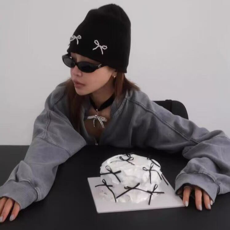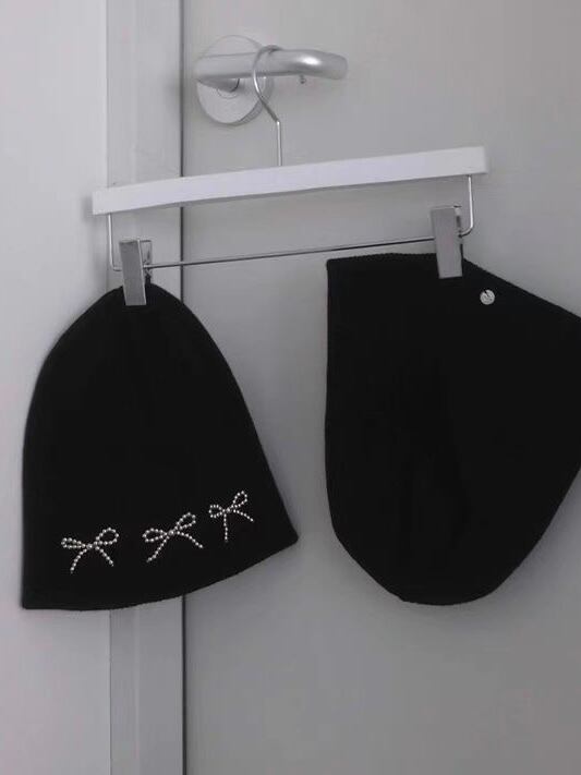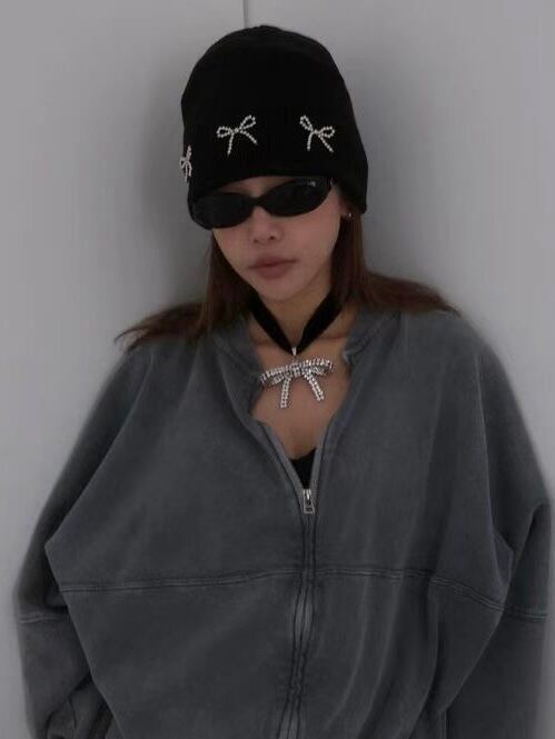 ラインストーンのリボンデザインがポイントのニット帽です。
