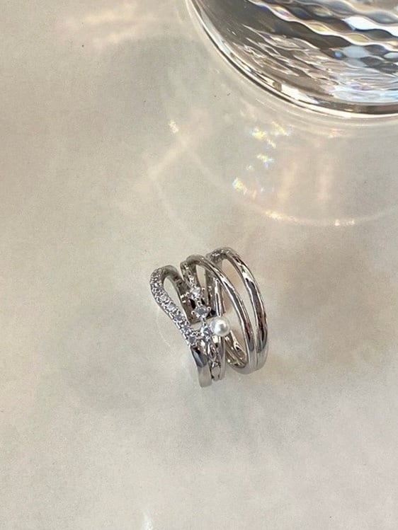 華奢なラインが重なったレイヤードデザインに、パールがアクセントになったリング。