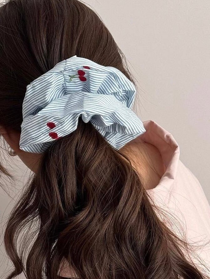 爽やかなストライプにチェリー刺繍が映えるシュシュ。
